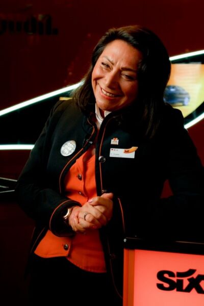 A woman in a SIXT uniform in the foreground is raising their index finger. In the background, several people can be seen, and the image is illuminated by orange-colored light beams.
